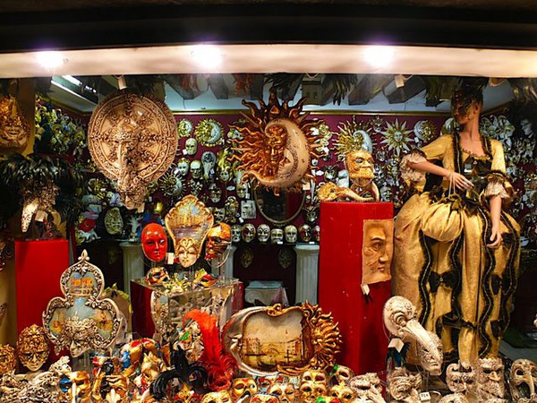 城市里面还是很热闹的, 街道里拥挤着人群, 两旁布满了各种小店. 威尼斯最多的就是玻璃工艺品店, 服装店, 皮包店, 以及威尼斯的面具: