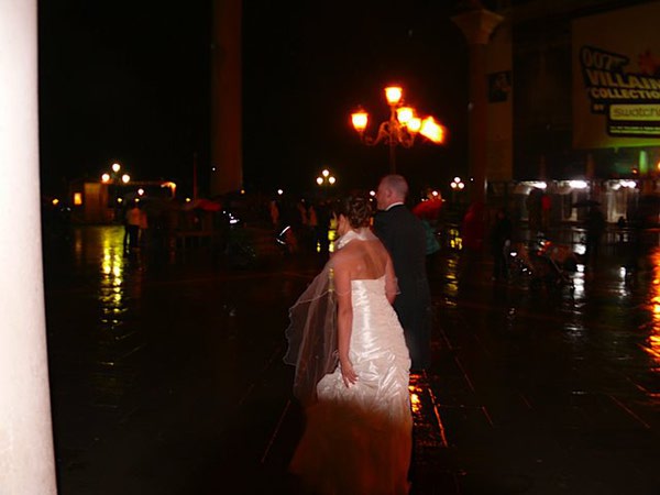 吃完午饭已经4点多, 天也慢慢黑了下来. 夜晚的威尼斯河上和我想象的完全不同, 没有什么船只, 也没有什么灯光. 一路来到San Marco, 据说这里是威尼斯最热闹的地方. 岸边的小商贩已经在收拾摊子回家了, 广场上显得更加>冷清. 正巧碰到几对在雨中拍结婚照的夫妻, 在威尼斯举行婚礼大概是超浪漫的吧, 祝福一下