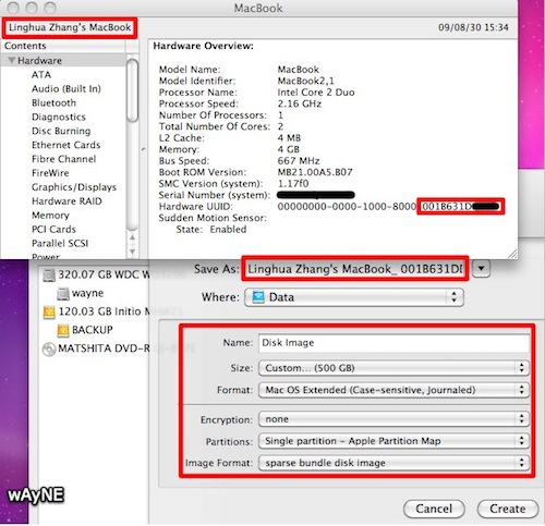 - 打开Disk Utility,选择New Image来创建一个新的备份文件。位置当然是在time capsule的Data文件夹下,输入刚才的文件名,指定自己喜欢的大小,其它各选项如下: